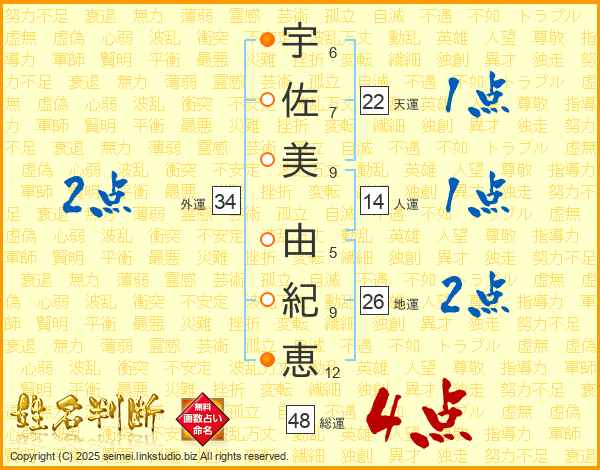 宇(6画)佐(7画)美(9画) 由(5画)紀(9画)恵(12画)