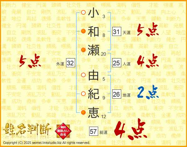 小(3画)和(8画)瀬(20画) 由(5画)紀(9画)恵(12画)