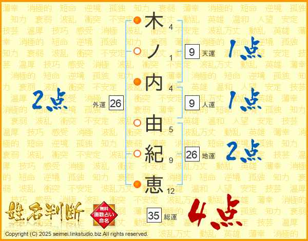 木(4画)ノ(1画)内(4画) 由(5画)紀(9画)恵(12画)