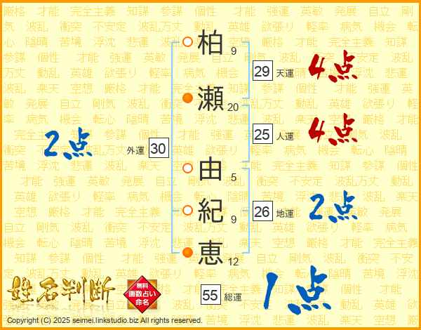 柏(9画)瀬(20画) 由(5画)紀(9画)恵(12画)