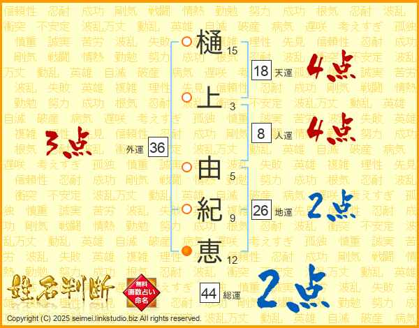 樋(15画)上(3画) 由(5画)紀(9画)恵(12画)