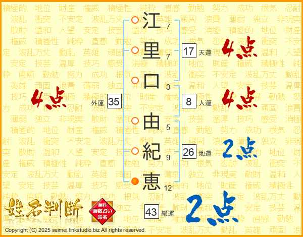 江(7画)里(7画)口(3画) 由(5画)紀(9画)恵(12画)