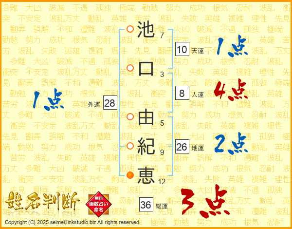 池(7画)口(3画) 由(5画)紀(9画)恵(12画)