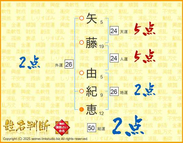 矢藤由紀恵さんの人運は24画の5点!
