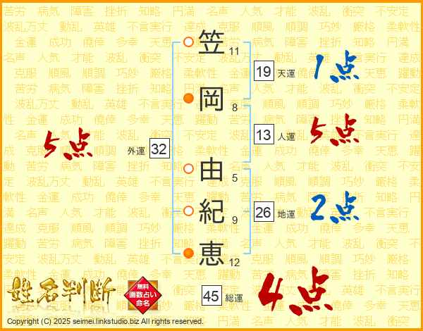 笠(11画)岡(8画) 由(5画)紀(9画)恵(12画)