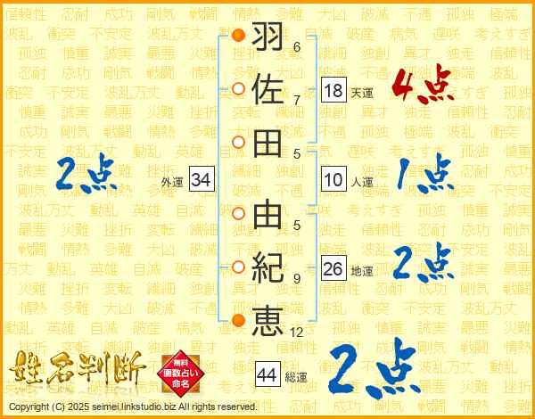 羽(6画)佐(7画)田(5画) 由(5画)紀(9画)恵(12画)