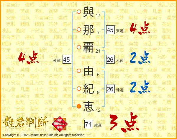 與(17画)那(7画)覇(21画) 由(5画)紀(9画)恵(12画)
