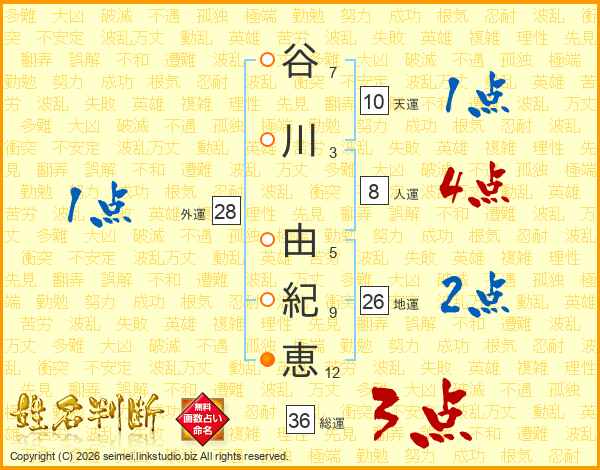 谷(7画)川(3画) 由(5画)紀(9画)恵(12画)