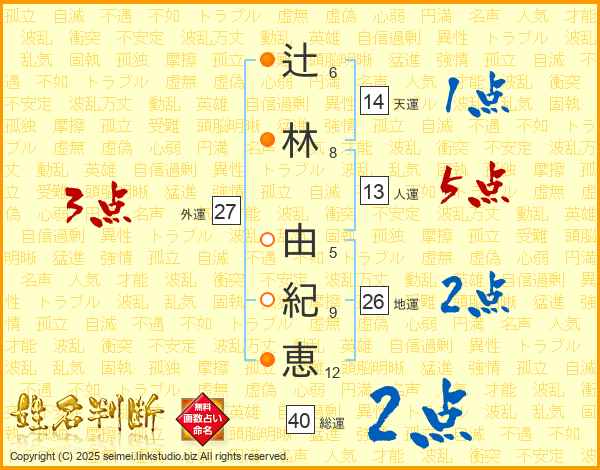 辻(6画)林(8画) 由(5画)紀(9画)恵(12画)