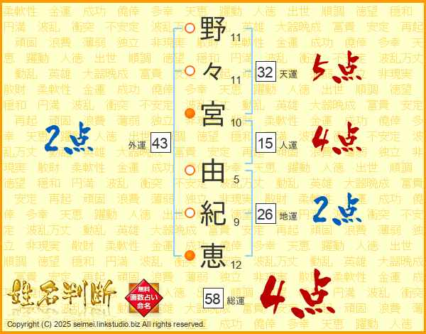 野々宮由紀恵さんの総運は58画の4点!