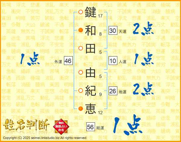 鍵(17画)和(8画)田(5画) 由(5画)紀(9画)恵(12画)