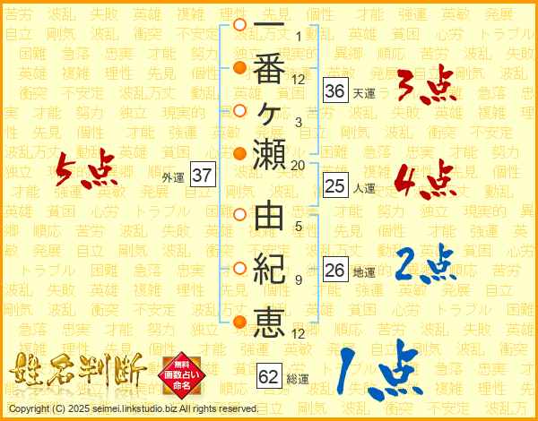 一(1画)番(12画)ヶ(3画)瀬(20画) 由(5画)紀(9画)恵(12画)
