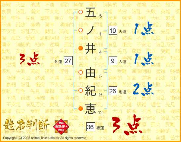 五(5画)ノ(1画)井(4画) 由(5画)紀(9画)恵(12画)