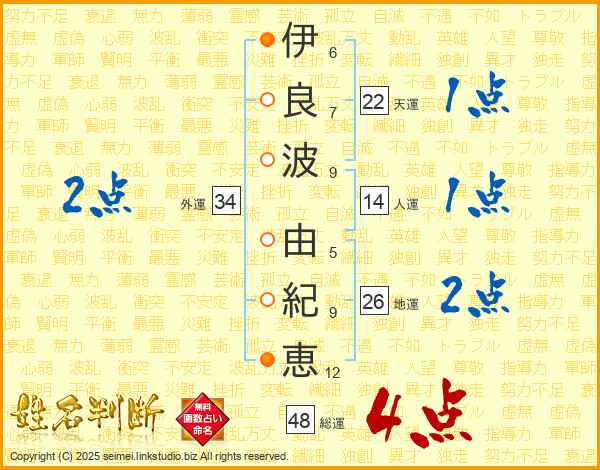伊(6画)良(7画)波(9画) 由(5画)紀(9画)恵(12画)
