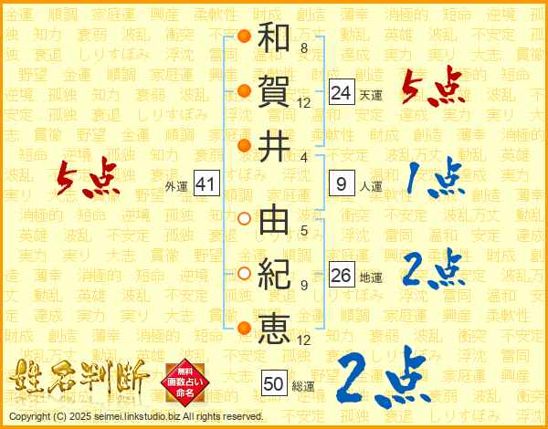 和(8画)賀(12画)井(4画) 由(5画)紀(9画)恵(12画)