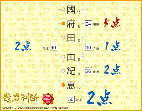 國(11画)府(8画)田(5画) 由(5画)紀(9画)恵(12画)