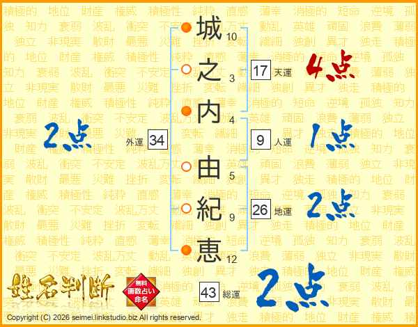 城之内由紀恵さんの総運は43画の2点!