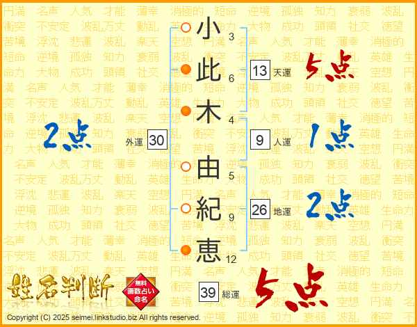 小(3画)此(6画)木(4画)  由(5画)紀(9画)恵(12画)