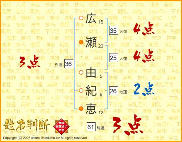 広(15画)瀬(20画) 由(5画)紀(9画)恵(12画)