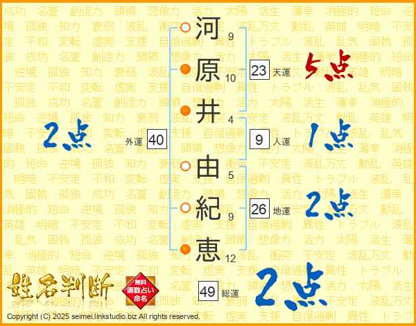 河(9画)原(10画)井(4画) 由(5画)紀(9画)恵(12画)