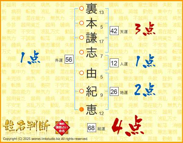 裏本謙志由紀恵さんの総運は68画の4点!