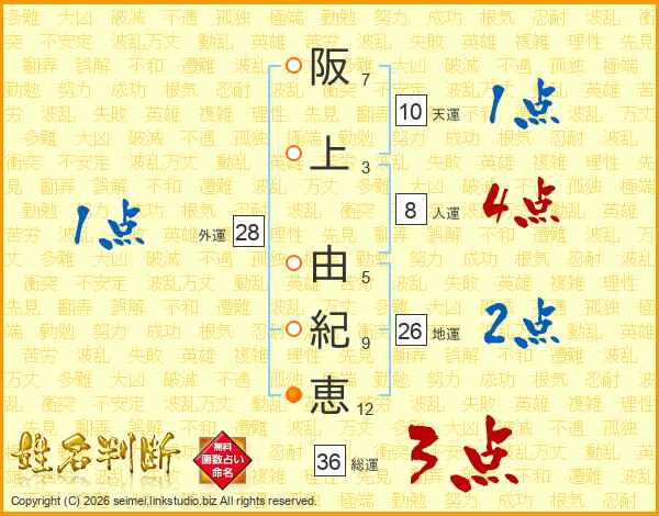 阪(7画)上(3画) 由(5画)紀(9画)恵(12画)
