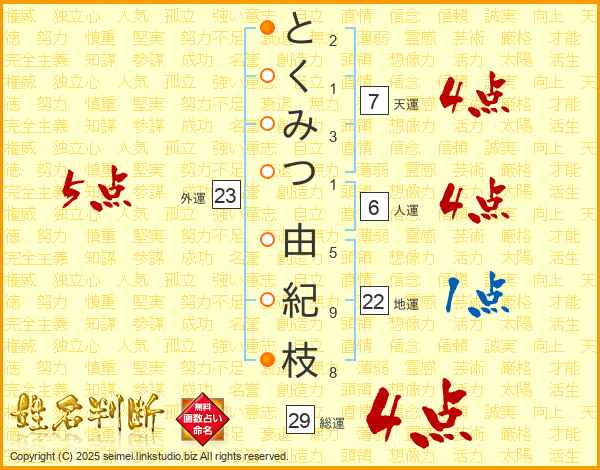 と(2画)く(1画)み(3画)つ(1画) 由(5画)紀(9画)枝(8画)