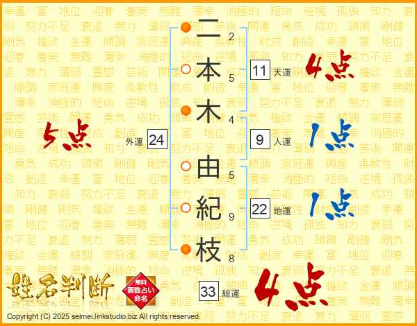 二(2画)本(5画)木(4画) 由(5画)紀(9画)枝(8画)