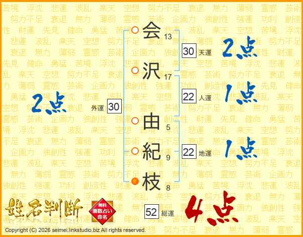 会沢由紀枝さんの総運は52画の4点!