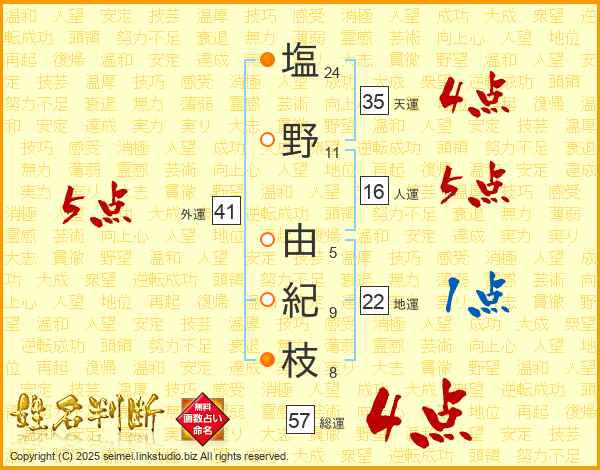 塩(24画)野(11画) 由(5画)紀(9画)枝(8画)