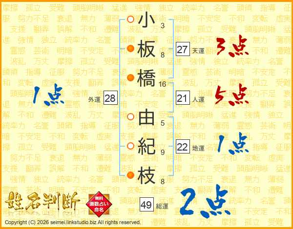 小(3画)板(8画)橋(16画) 由(5画)紀(9画)枝(8画)