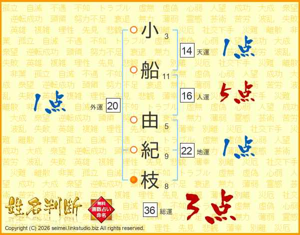 小(3画)船(11画) 由(5画)紀(9画)枝(8画)