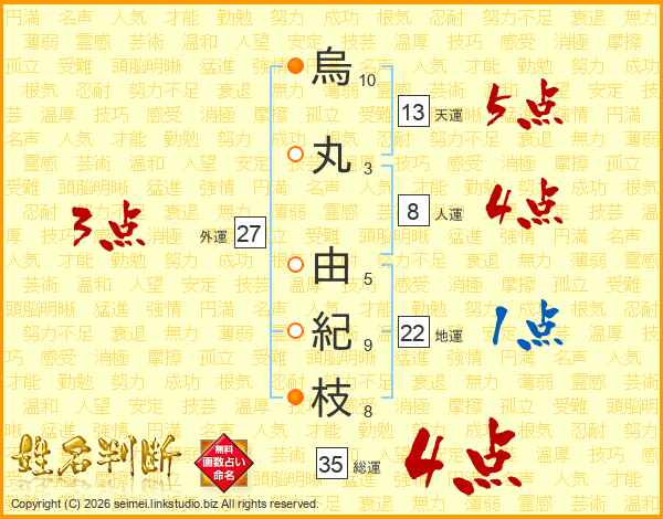 烏(10画)丸(3画) 由(5画)紀(9画)枝(8画)