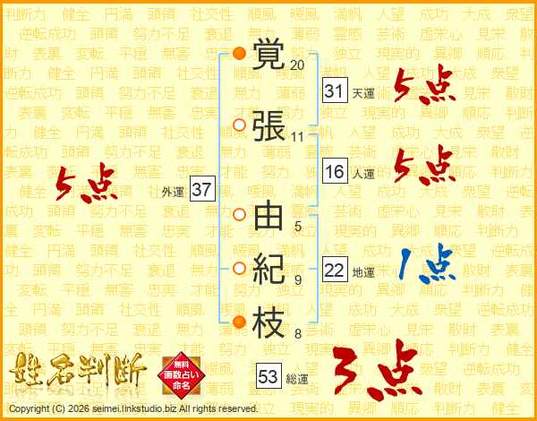 覚(20画)張(11画) 由(5画)紀(9画)枝(8画)