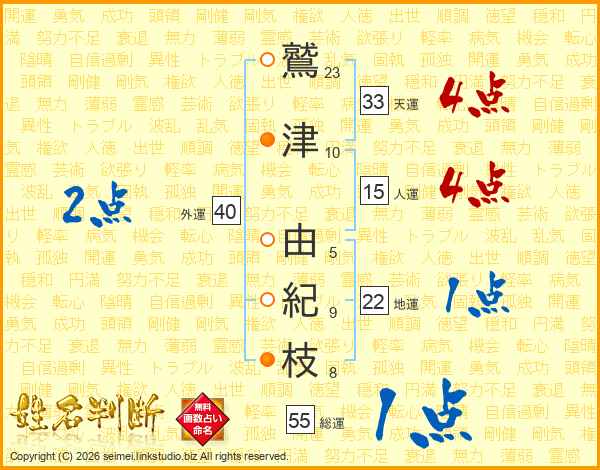 鷲(23画)津(10画) 由(5画)紀(9画)枝(8画)