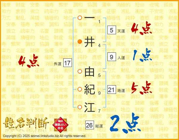 一(1画)井(4画) 由(5画)紀(9画)江(7画)