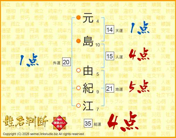 元(4画)島(10画) 由(5画)紀(9画)江(7画)