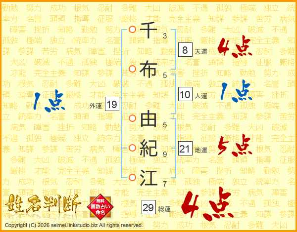 千(3画)布(5画) 由(5画)紀(9画)江(7画)