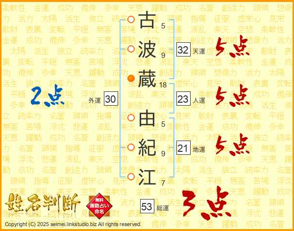 古(5画)波(9画)蔵(18画) 由(5画)紀(9画)江(7画)
