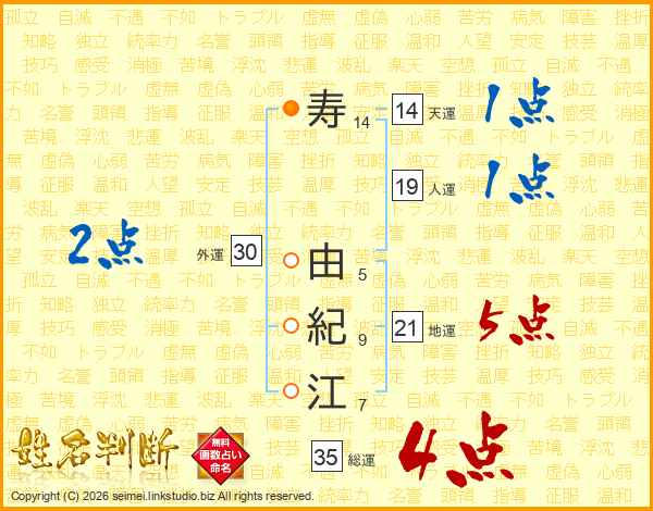 寿(14画) 由(5画)紀(9画)江(7画)