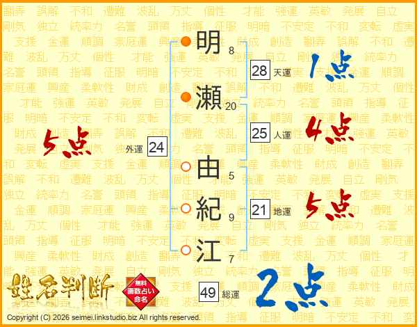 明瀬由紀江さんの総運は49画の2点!