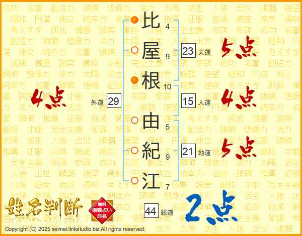 比(4画)屋(9画)根(10画) 由(5画)紀(9画)江(7画)