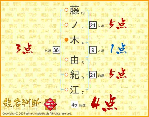 藤(19画)ノ(1画)木(4画) 由(5画)紀(9画)江(7画)