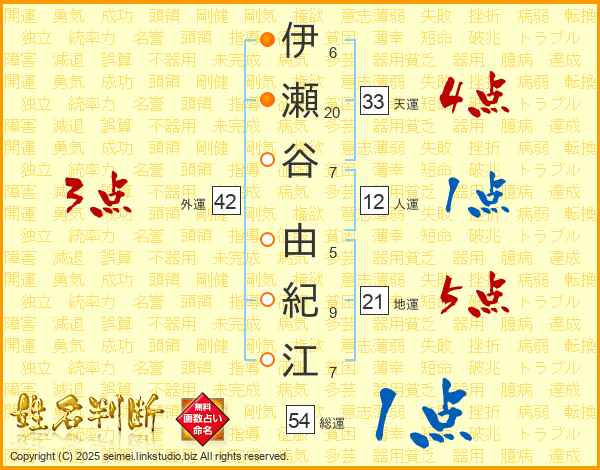 伊(6画)瀬(20画)谷(7画) 由(5画)紀(9画)江(7画)