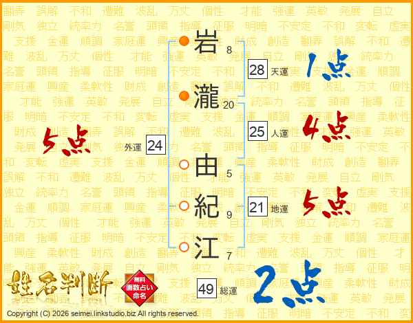 岩(8画)瀧(20画) 由(5画)紀(9画)江(7画)