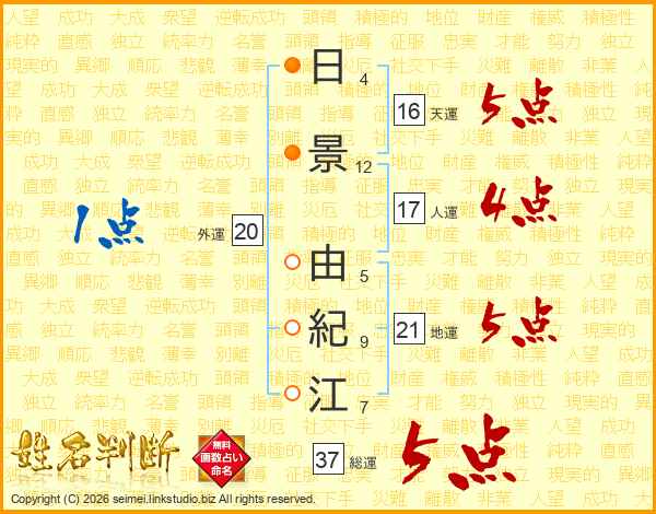 日(4画)景(12画) 由(5画)紀(9画)江(7画)