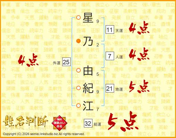 星(9画)乃(2画) 由(5画)紀(9画)江(7画)