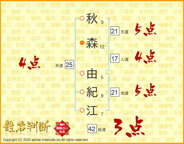 秋(9画)森(12画) 由(5画)紀(9画)江(7画)
