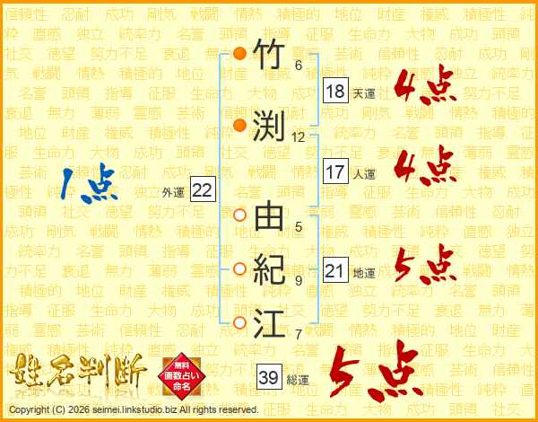 竹(6画)渕(12画) 由(5画)紀(9画)江(7画)