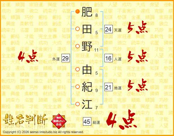 肥(8画)田(5画)野(11画) 由(5画)紀(9画)江(7画)